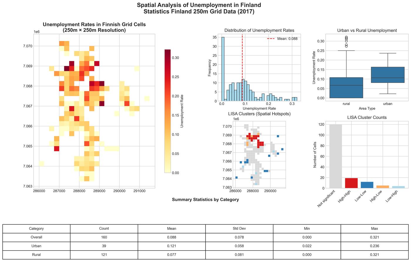 A comprehensive spatial analysis of unemployment patterns in Jakobstad, Finland using Statistics Finland's 250-meter grid data, revealing urban-rural disparities and spatial clustering through advanced GIS techniques.