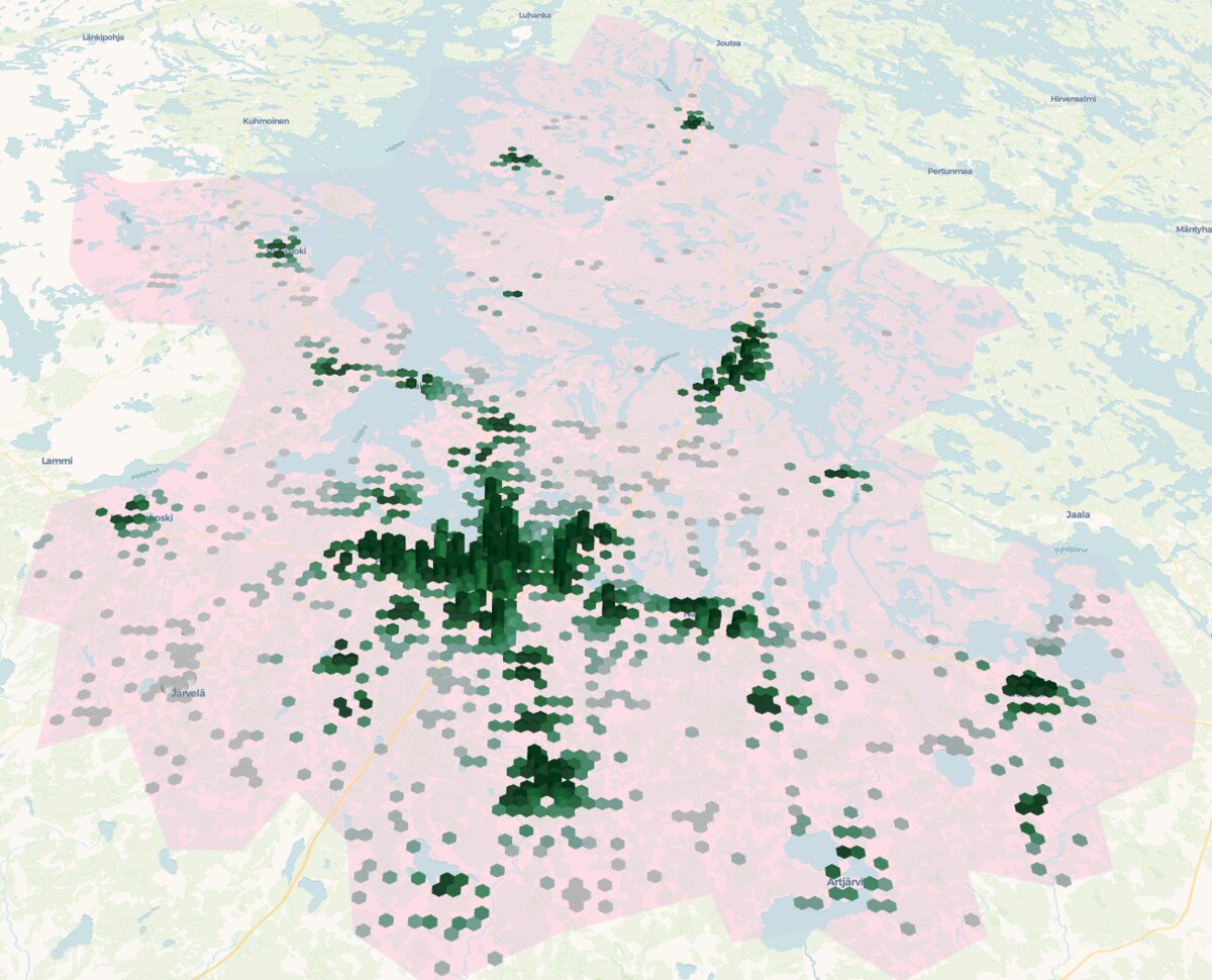 Children (0-14 years old) population visualized over the are of interest. The higher and greener the hexagon the more the population (going from 0 to 444 children per hexagon).